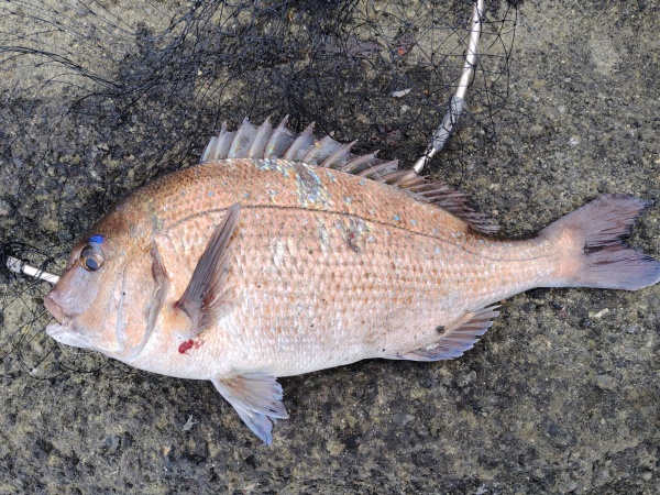 釣り上げたのは45㌢のマダイ。嬉しい坊主逃れの一発でした。