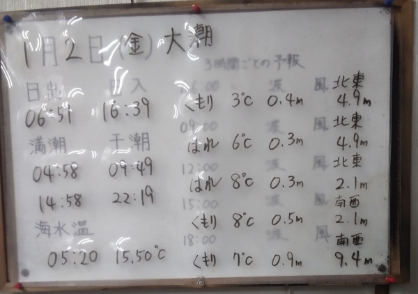 風も波も穏やかで良いコンディションで竿が出せそうです。気温は上がらず、寒い釣行になりそうですが、良い型のメジナやカワハギ、マダイ、クロダイが期待できます。