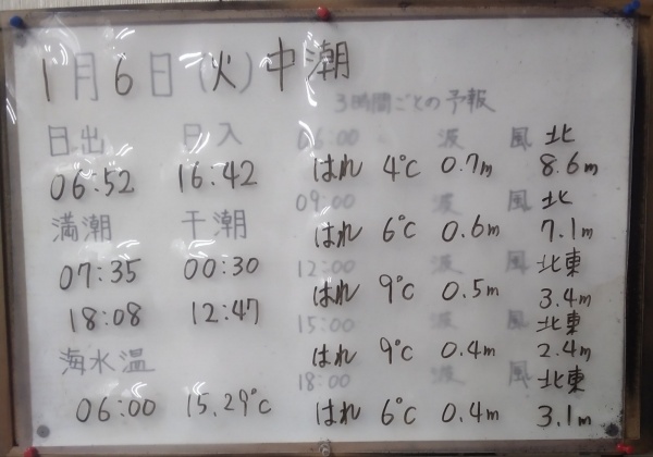 朝のうちは冷たい北がやや強く吹きそうですが昼前には治まりそうです。日中は気温は上がりませんが、風も波も穏やかで良いコンディションで竿が出せそうです。