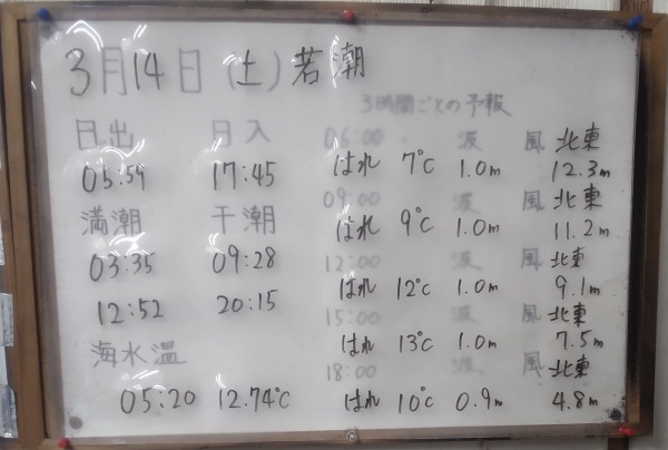 冷たい北東が一日中吹きそうです。波はやや高く北向の磯ではアゲンストが強くやりづらい釣りになりそうです。